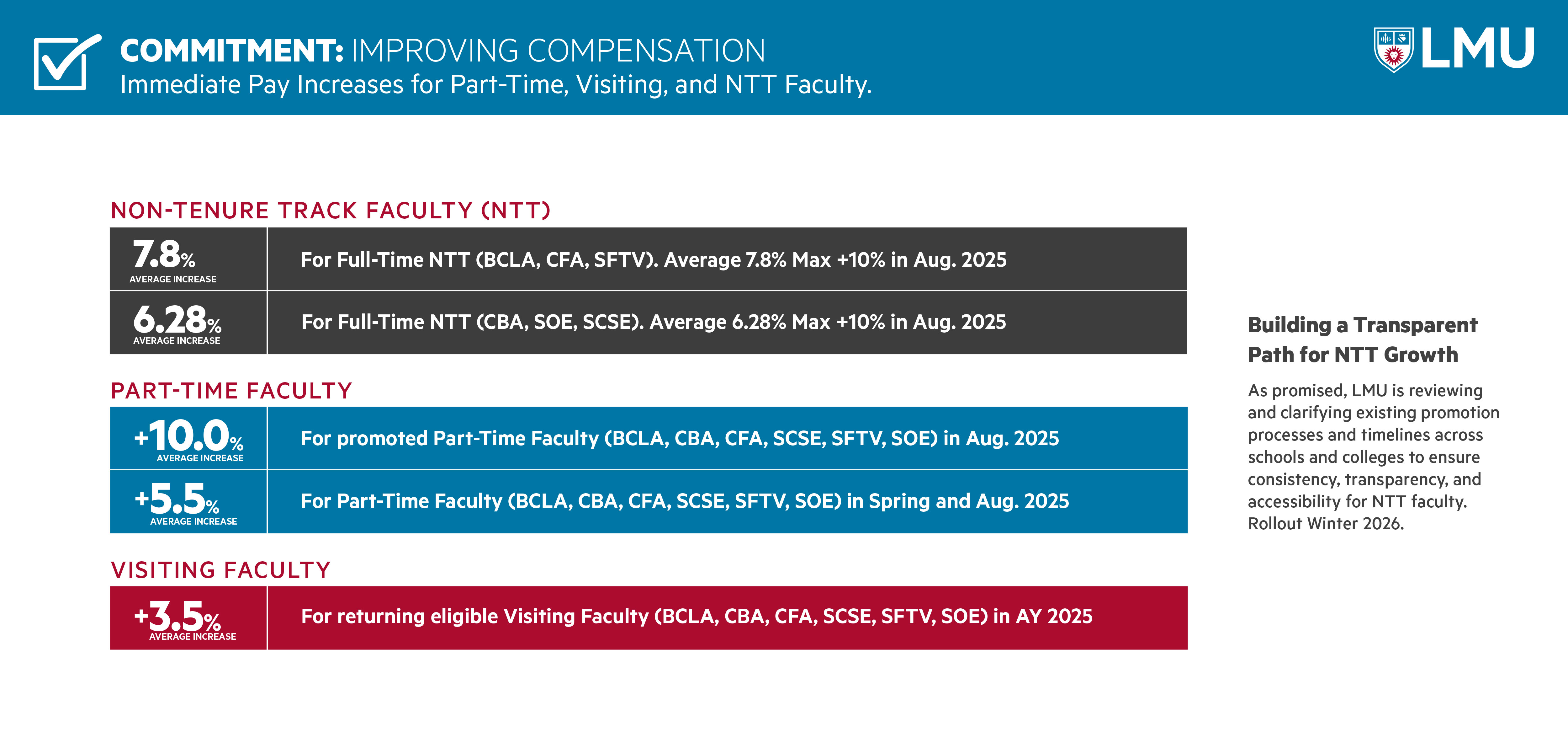 LMU is implementing salary and merit increases for full-time non-tenure track (NTT) faculty in Bellarmine College of Liberal Arts (BCLA), College of Communication and Fine Arts (CFA), and School of Film and Television (SFTV) that had been paused due to collective bargaining. These adjustments, averaging 3.85%, with some individual increases up to 10%, are part of LMU's Multi-Year Compensation Initiative and reflect the university's commitment to equitable, competitive, and market-based pay. When combining market adjustments with merit-based increases and promotions, faculty within the former bargaining units in BCLA, CFA, and SFTV receive an average total increase of 7.8%, effective August 16, 2025. Faculty in CBA, SOE, and SCSE received their merit, promotion, and market adjustments on August 16, 2025. Market-based increases averaged 3.45%, with some individual increases as high as 10%. Merit and promotion increases averaged 4.72%. Combined, the total average increase across this group was 6.28%.