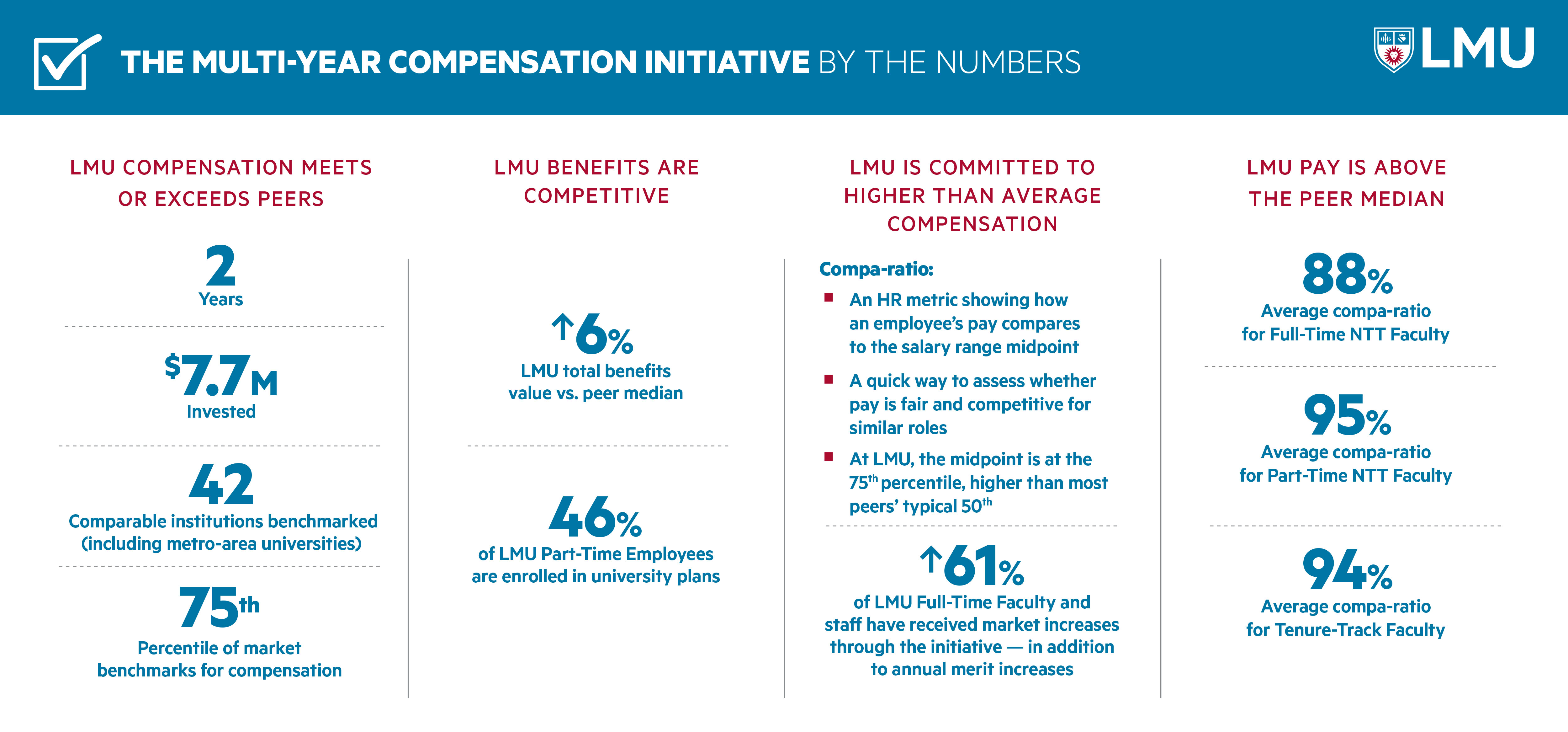 LMU is committed to supporting, retaining, and attracting exceptional talent through compensation that meets or exceeds market benchmarks. Our approach is guided by transparent, market-based metrics and informed by comparisons with peer institutions, ensuring pay that is competitive, equitable, and aligned with LMU's mission and values.