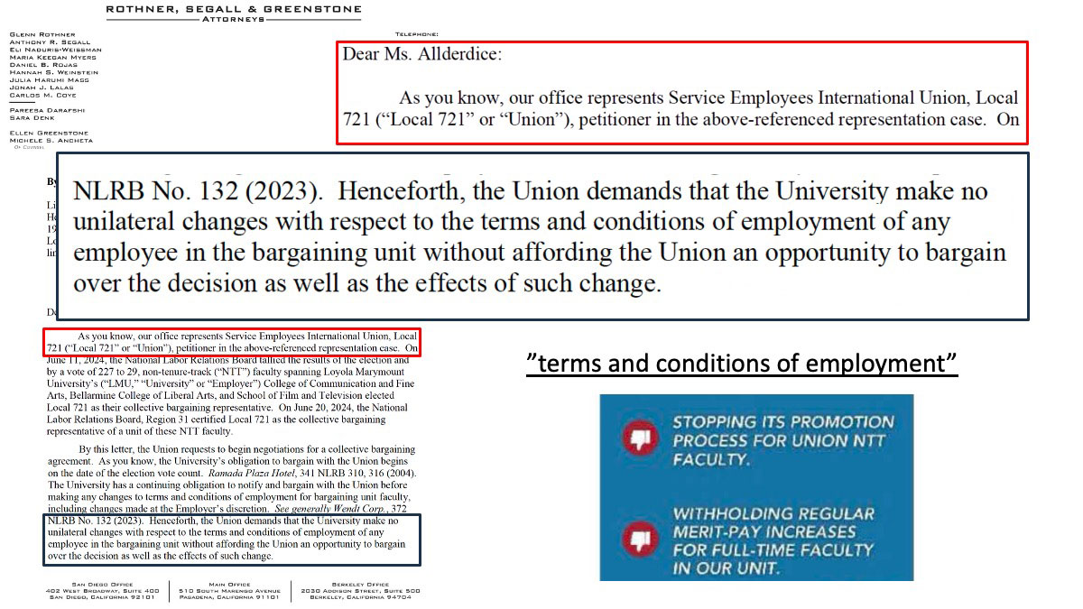 SEIU attorneys issued demand letters to prevent the university from making improvements including titling initiatives and changes to compensation such as pay raises with NTT and Visiting Faculty outside the bargaining process. Following the exemption, LMU moved quickly to apply the increases retroactively.
